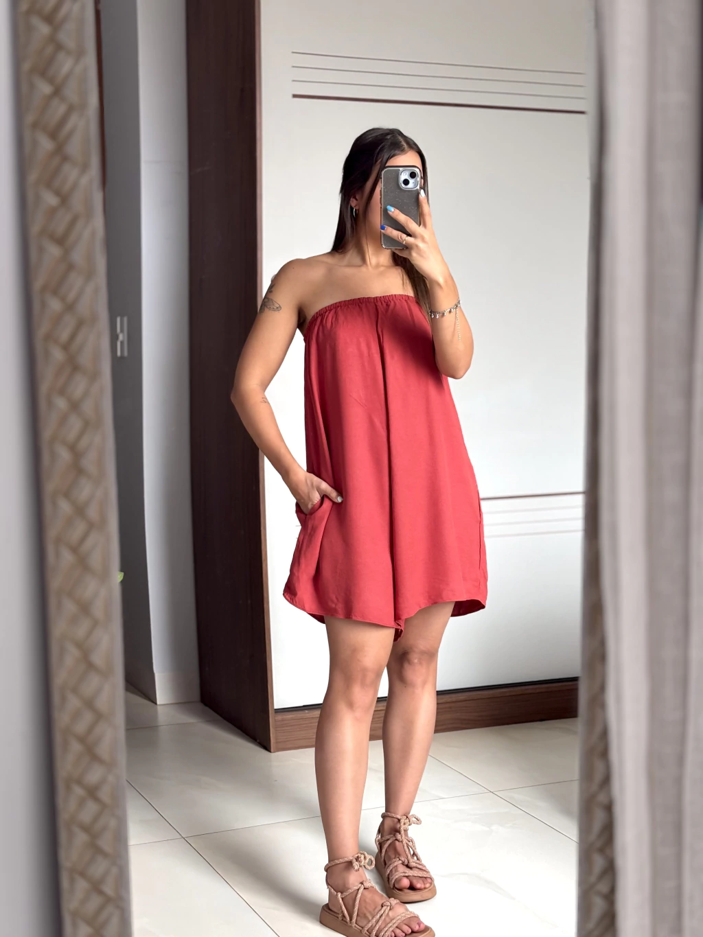 Com design tomara que caia e elástico no busto forrado, valoriza a silhueta com delicadeza e segurança. Seus bolsos funcionais nas laterais são perfeitos para o dia a dia, unindo praticidade e charme. O cinto do mesmo tecido permite ajustar o macacão ao corpo, garantindo um caimento impecável.